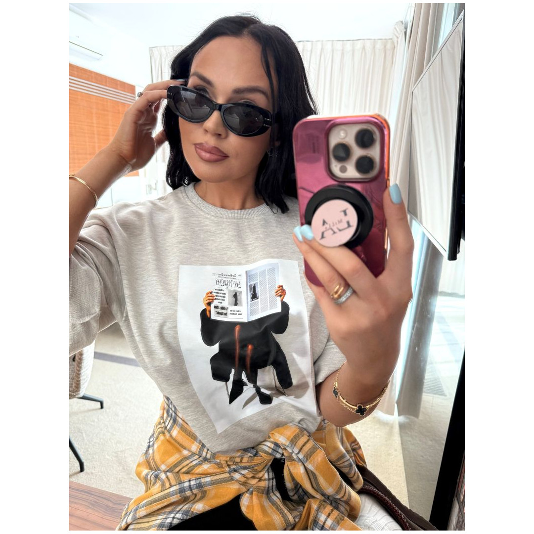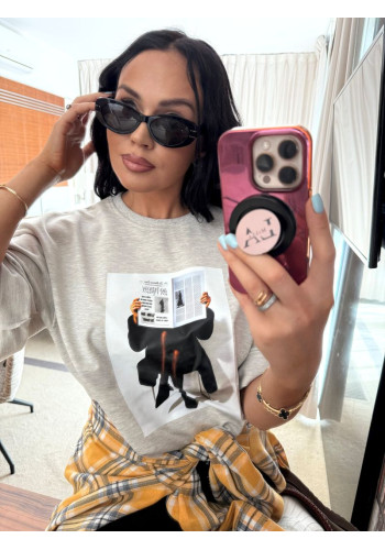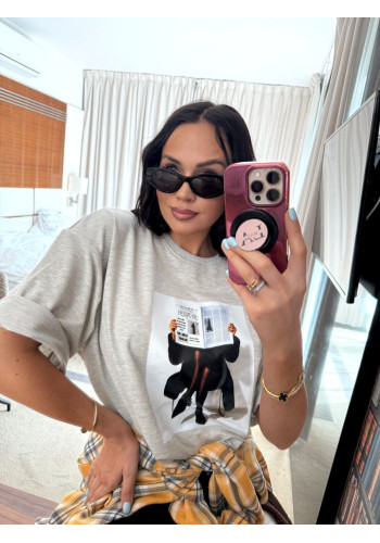 Zwrot do 14 dni!Szary t-shirt dama z gazetą to wyjątkowy model, który łączy minimalizm z artystycznym akcentem. Klasyczna, prosta forma koszulki została urozmaicona efektownym nadrukiem. Dzięki temu zwykły t-shirt zyskuje , niepowtarzalny, modowy charakter. Koszulka świetnie komponuje się zarówno z jeansami i trampkami, jak i ze spódnicą czy marynarką, tworząc casualowy look.